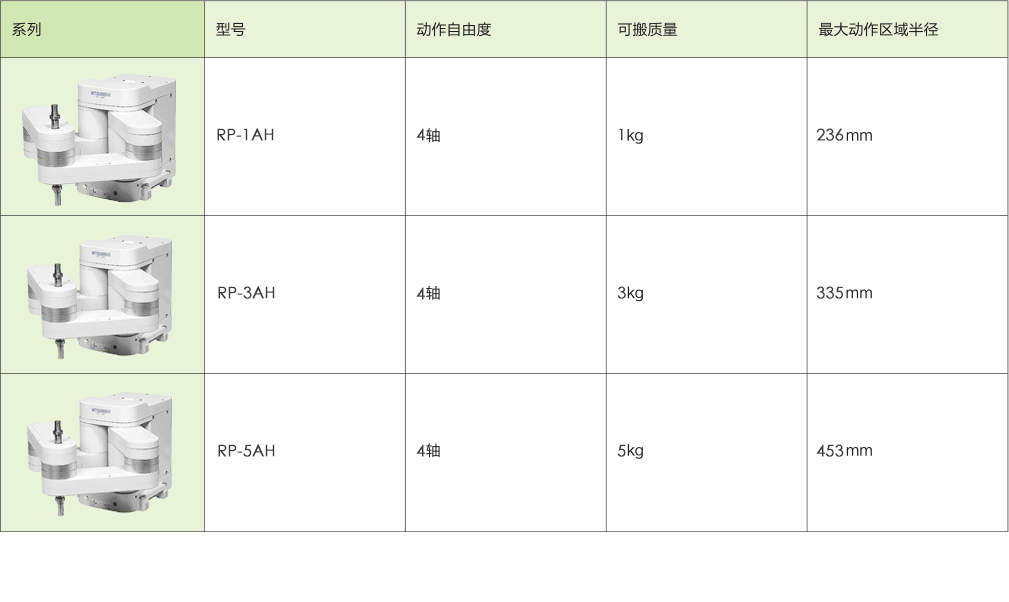 ■ 对应不同用途的机种阵容:从最小尺寸的RP-1AH到最大可搬重量5kg的RP-5AH、3机种阵容;对应无尘规格(Class 100/0.3µm)。(特殊规格)